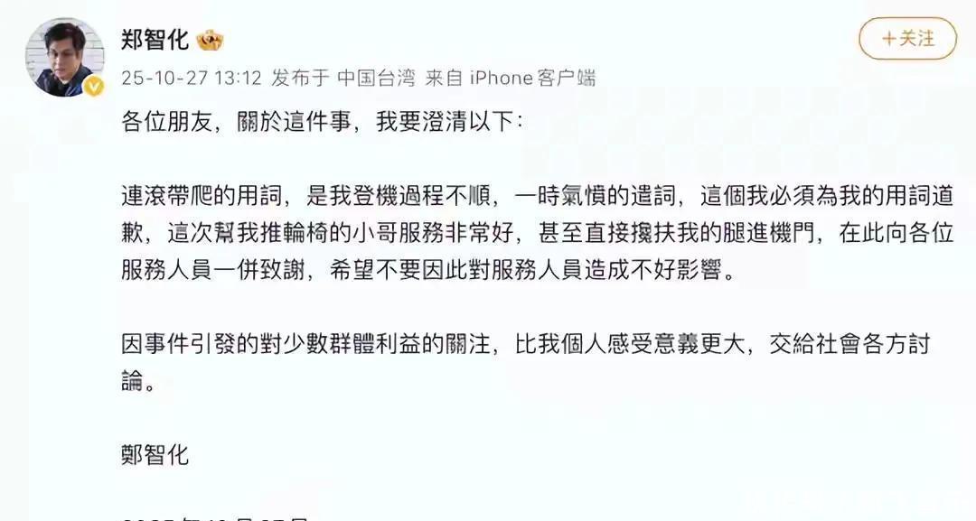 机场事件反转,视频公开,郑智化发文道歉,连滚带爬是谴词 郑智化吐槽深圳机场这事儿,闹得是越来越大。一开始机场还出来道歉了,说会整改,结果后来登机的真实视频一曝光,情况就不一样了。之前郑智化还发过长文,说内地好几家机场服务差,南京、上海、新疆的机场都被他点到名了,谁能想到没过多久,他自己倒发文道歉了,难道是舆论压力太大了? 10 月 27 号中午,郑智化就深圳机场那事儿解释了,说 “连滚带爬” 那词儿,是他当时登机不顺,一时生气才说的。还特意说要为这话道歉,说当时帮他推轮椅的小哥服务特别好,甚至还扶着他的腿进机门,也谢谢其他工作人员,怕因为自己的话影响到他们。其实他说的这些,跟视频里拍的是一样的。